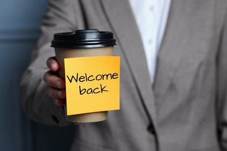 Woman holding paper coffee cup with Welcome Back sticky note, closeup