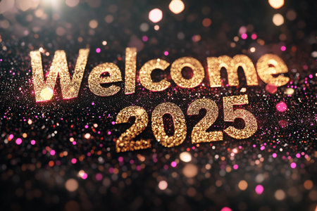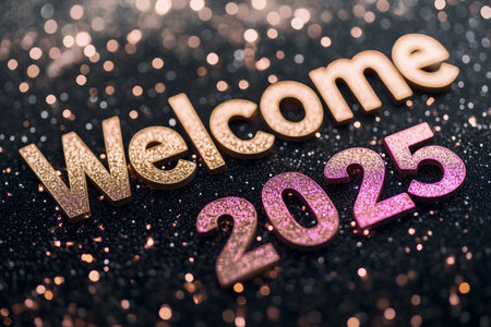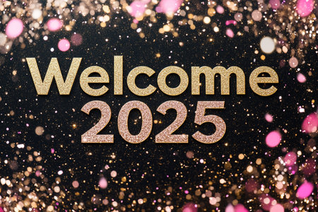 Glittering golden welcome 2025 text on bokeh background.