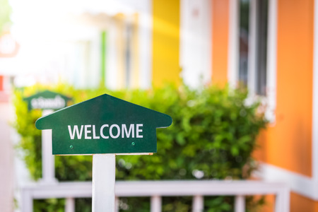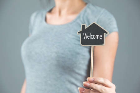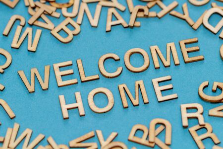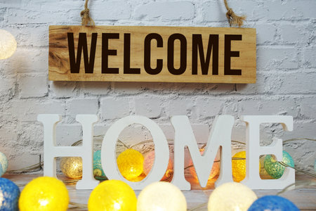 Welcome Home alphabet letters with wooden signboard hanging on white brick wall background