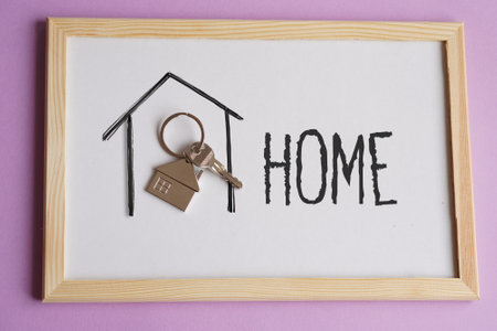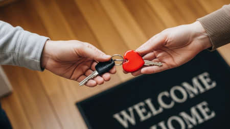The image depicts a moment where one person is handing over a set of house keys to another person. The keys are attached to a red heart-shaped keychain. In the background, there is a sign that reads 'WELCOME HOME'. The scene suggests a significant event, likely the purchase or rental of a new home.
