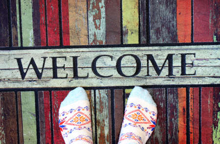 Feet are on the mat. Warm woolen socks with various patterns are dressed on the feet. A rug of various bright colors with the inscription - Welcome.