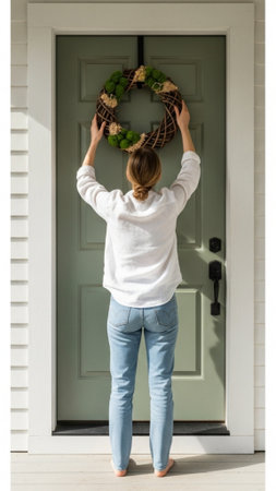 A tall, vertical composition capturing a person in full body, centered, decorating their front door