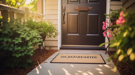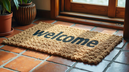 Cozy home welcome mat on sunlit tiled entrance with potted plants. That the image is generated using AI.