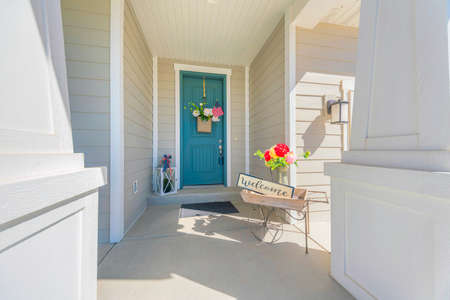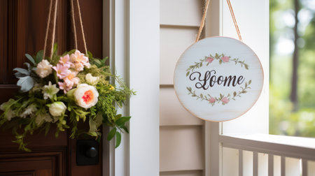 Decorated entrance of a house with welcome sign on a wooden barrow