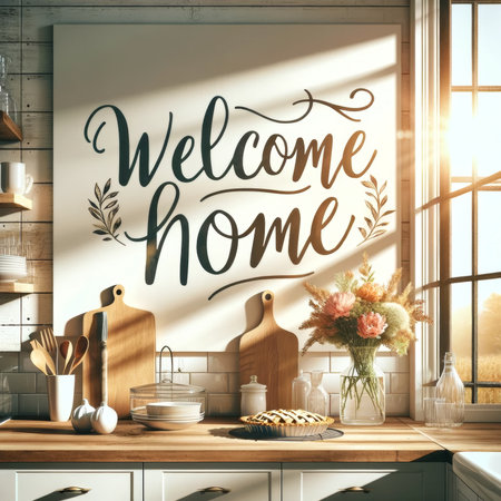 A bright kitchen with a Welcome Home sign basks in the morning light, crafting a scene of domestic bliss.