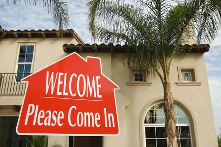 Welcome, Please Come In Real Estate Sign with new home in the background.