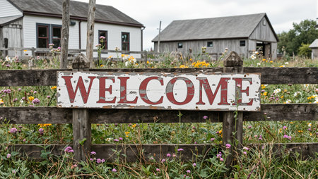 Weathered Welcome sign on rustic fence in rural town with wildflowers Vintage charm