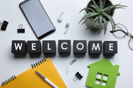 Word WELCOME made with black cubes, cup of coffee and smartphone on wooden table, flat lay