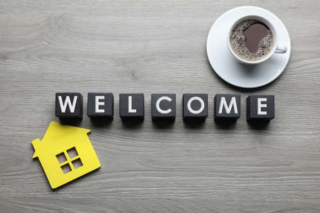 Black cubes with word Welcome, house model and cup of coffee on wooden table, flat lay