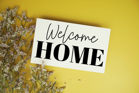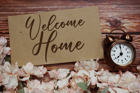 Welcome Home text with alarm clock and flowers decoration on wooden background