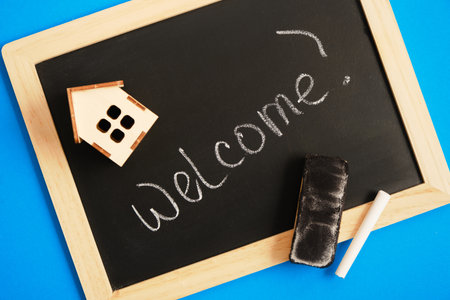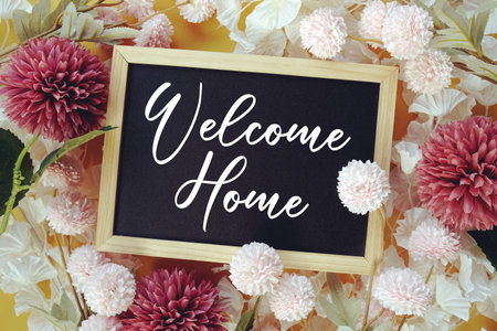 Welcome Home written on chalkboard with flowers blooming top view on blue background