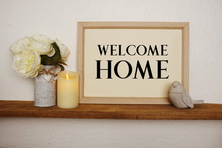 Welcome Home text written on whiteboard with candle light and bird statue on wooden shelf