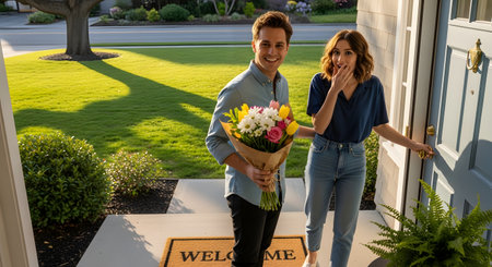 A smiling man stands on the front porch of a suburban house, holding a bouquet of flowers (tulips and daisies) as a surprise for a woman. The woman is opening the door with a surprised and happy expression, her hand to her mouth. The scene is set on a sunny day with a green lawn.