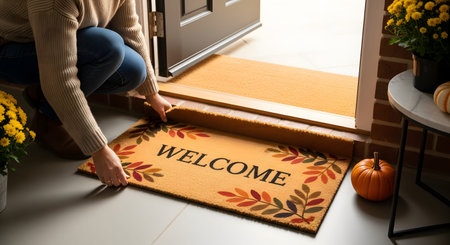 A person places a fresh coir welcome mat at the threshold of an open front door decorated with autumn pumpkins and yellow mums. The scene evokes a sense of hospitality and seasonal warmth at the home entrance.