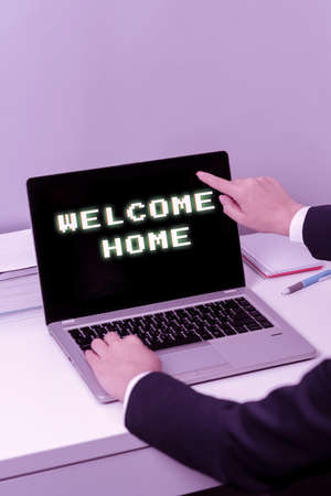 Conceptual display Welcome Home. Word for Expression Greetings New Owners Domicile Doormat Entry Man In Suit Displaying Online Symbols Used For Important Business Ideas.