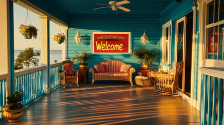 A vibrant coastal porch featuring inviting furniture, colorful decor, and a beautiful ocean view. Perfect for relaxation and summer gatherings.