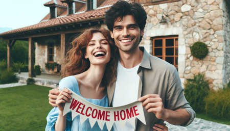 A couple is holding a Welcome Home sign in front of a house. They are smiling and seem happy