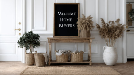 A black and white sign welcomes home buyers. The room is decorated with potted plants and baskets, giving it a warm and inviting atmosphere