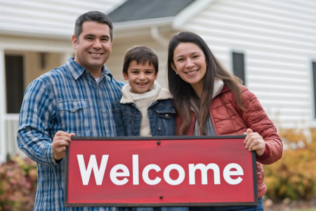 Smiling family holding welcome sign while standing outdoors in front of their new suburban house