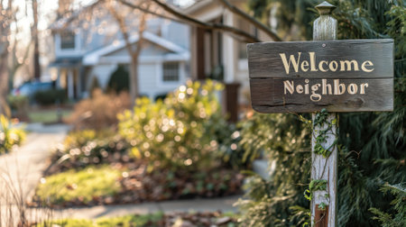 Wooden 'Welcome Neighbor' sign in a suburban setting