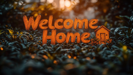 A cheerful welcome home sign glows warmly as the sun sets behind rich foliage.