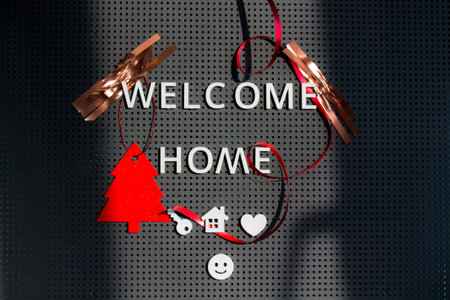 White lettering Welcome Home on a dark gray or black background. New Year's decor - red Christmas tree, text Merry Christmas, sparkly tinsel, tsar. Symbol of key for house and heart. Festive backdrop.