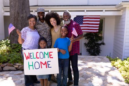 Multi-generation mixed race family enjoying their time at a garden, embracing, kids are holding mini flags and a welcome home sign, with big flag in the background