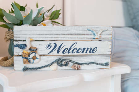wooden Welcome sign on reception in hotel ,antique rustic board, Welcome Plate Made from Wood with Beautiful Maritime Decoration.Summer time sea vacation concept.