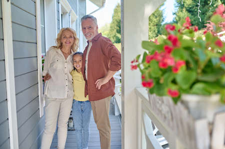 Mixed race girl enjoying her time at a garden with her family, holding a welcome home sign, looking at the camera and smiling, with her family in the background