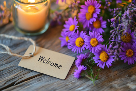 A photo of the text Welcome written on an empty tag, next to purple flowers and daisies, with a wood background and a candle. --ar 3:2 --v 6.1 Job ID: ff983905-e603-4942-9f76-2523c4d2834c
