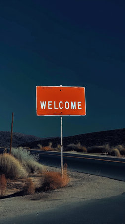 Red signpost with the words Welcome against the night landscape backdrop. Welcome button concept. Generative AI.