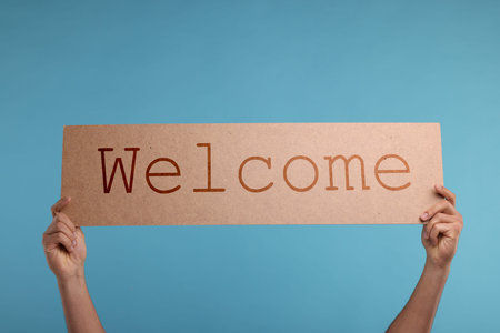 Welcome sign in man's hands against light blue background, closeup