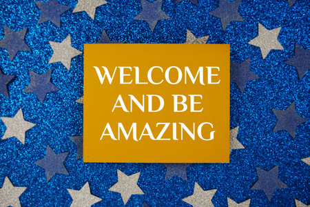 Welcome and Be Amazing motivational and inspiration quote on Sparkling Blue Star Background