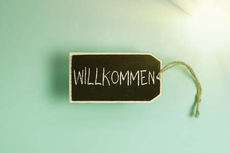 Text sign showing Willkommen. Business overview welcoming showing event or your home something to that effect Collection of Blank Empty Sticker Tags Tied With A String For Information Label Sign