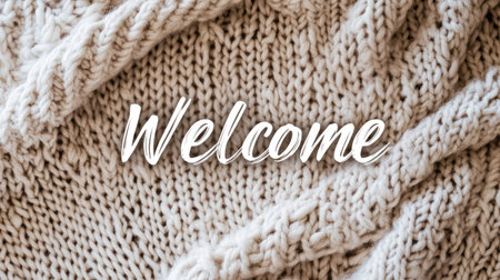 A cozy Welcome text in handwritten-style font, placed on a background of knitted fabric and soft textures, ideal for a warm, homely feel.