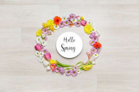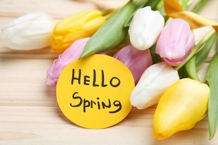 Beautiful flowers and card with text HELLO SPRING on wooden background
