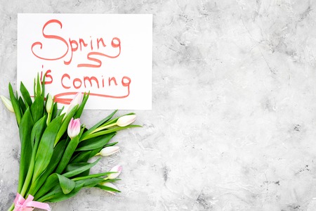Spring is coming hand lettering surrounded by delicate tulips on grey background top view.