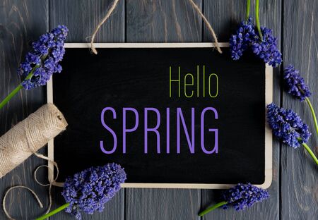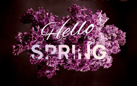 Hello Spring. Congratulatory bright lettering on a dark gray wooden background with spring lilac flowers.