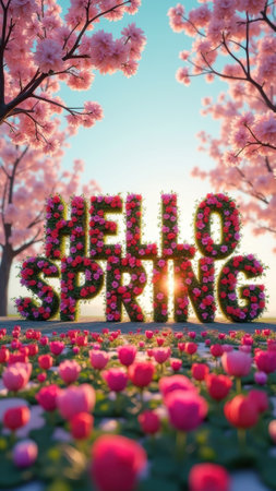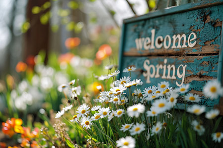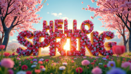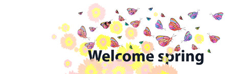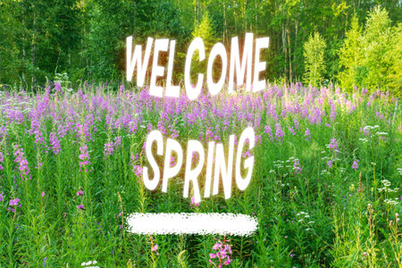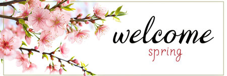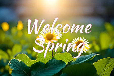 Welcome spring seasonal greetings wallpaper background for banner and commercial, beautiful nature flower and green with some sunrise.