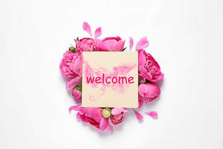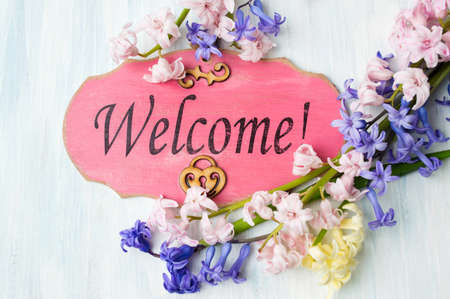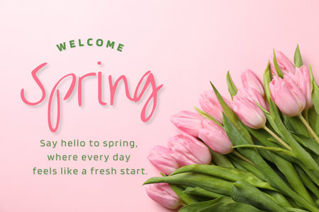 Welcome Sign and Tulip Flower Blooming Decoration on pink background