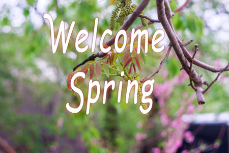 Welcome spring message - Springtime, flowers blossoming twigs. The beginning of the season. Selective focus