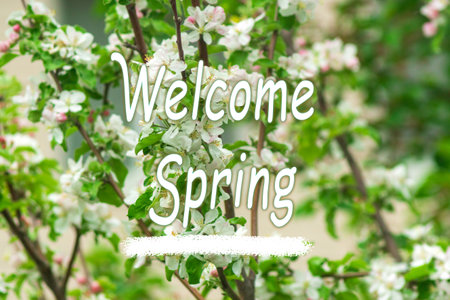 Delicate white cherries blossom flowers background with text Welcome Spring