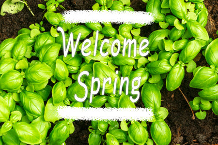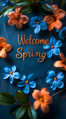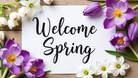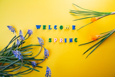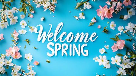 Welcome Spring Themed Pastel Coloured Background. Spring time floral flat lay minimalism greeting card.