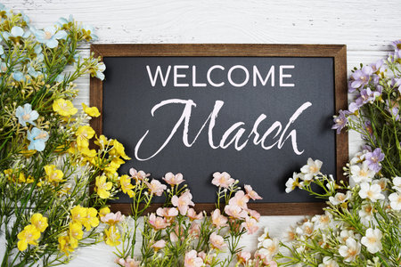 Welcome March text on chalkboard with flowers decoration top view on black background