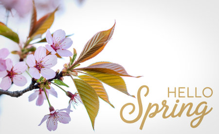 Close-up of blooming pink cherry blossoms and fresh, golden-tinged spring leaves against a bright white background with 'Hello Spring' text.