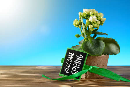Potted flower and Welcome spring sign on wooden table in sunny day