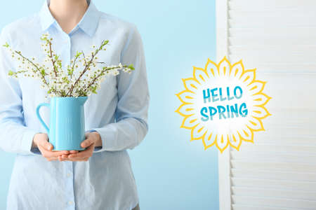 Woman holding jug with beautiful blooming tree branches at home. hello spring