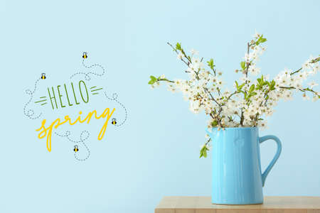 Hello Spring message - Springtime, flowers blossoming twigs. The beginning of the season. Selective focus