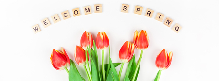 Creative flat lay top view welcome spring greeting card with red tulips flowers on white background with copy space. Long wide banner