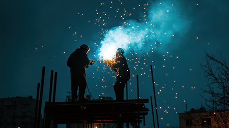This striking image captures two welders working under a night sky, creating bright sparks and vibrant blue smoke, highlighting urban construction activities.